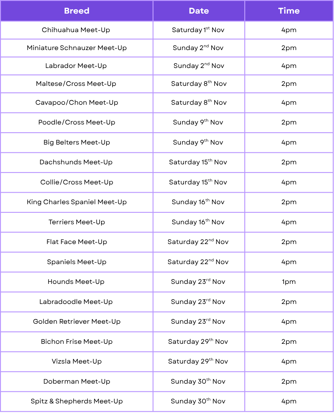 We run different breed meet ups every week. These breed meet ups give your pooches a chance to meet and play with dogs their own breed who have similar play styles, whilst you can chat to other owners and make new friends!