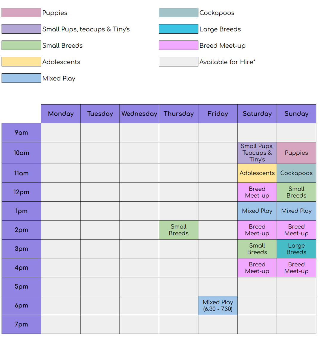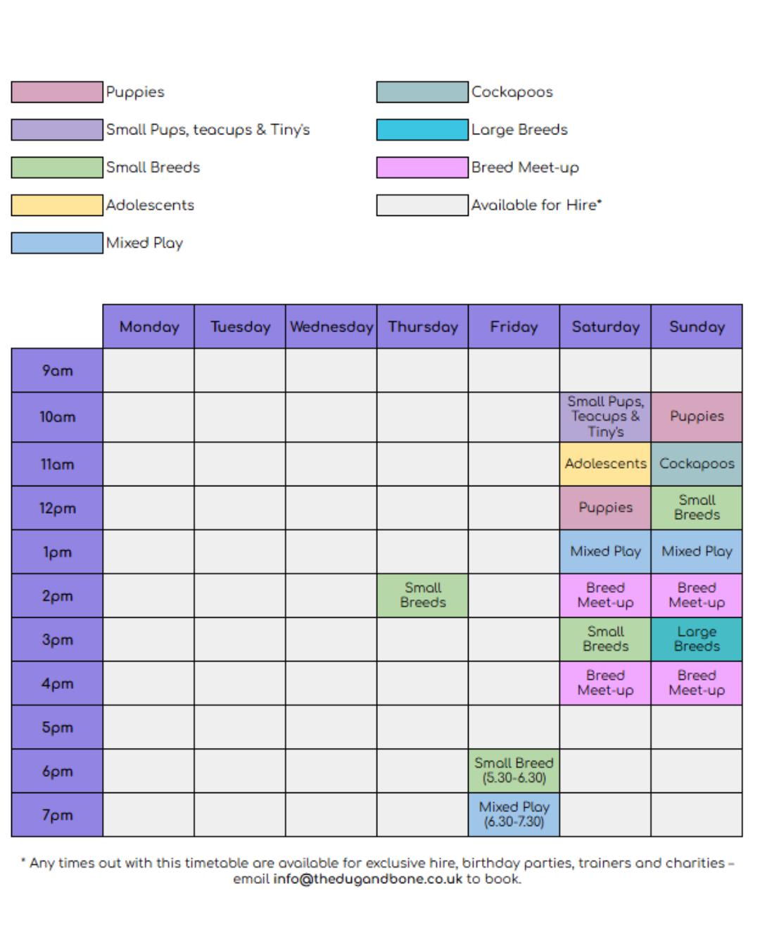*Any times outwith this timetable are available for exclusive hire, birthday parties, trainers, and charities — email info@thedugandbone.co.uk to book.